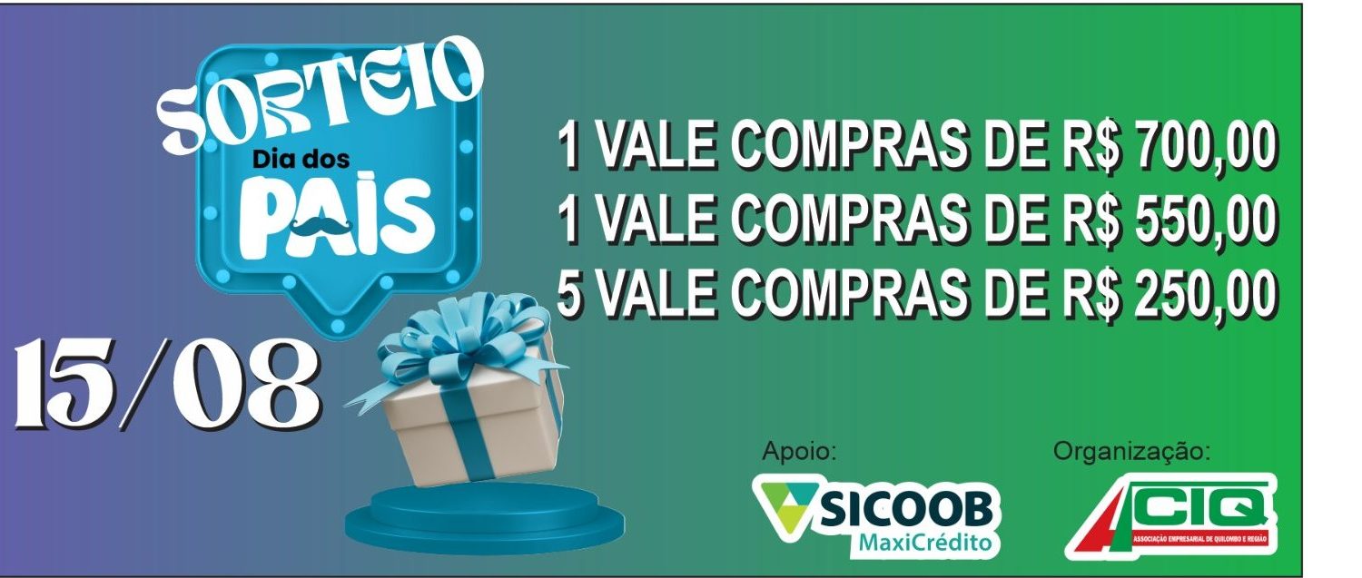 Sorteio de Dia dos Pais, compre no comércio associado ACIQ A ACIQ em parceria com a SICOOB lança a campanha do Dia das Pais. Os clientes que comprarem no comércio associado de Quilombo, Santiago do Sul, Formosa do Sul e Irati estarão concorrendo aos premios descritos na publicação.